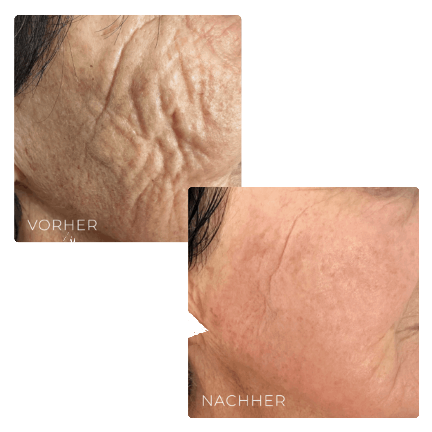 Bereits nach der ersten Behandlung sind sichtbare Verbesserungen erkennbar. Die Haut wirkt straffer, glatter und erfrischter.